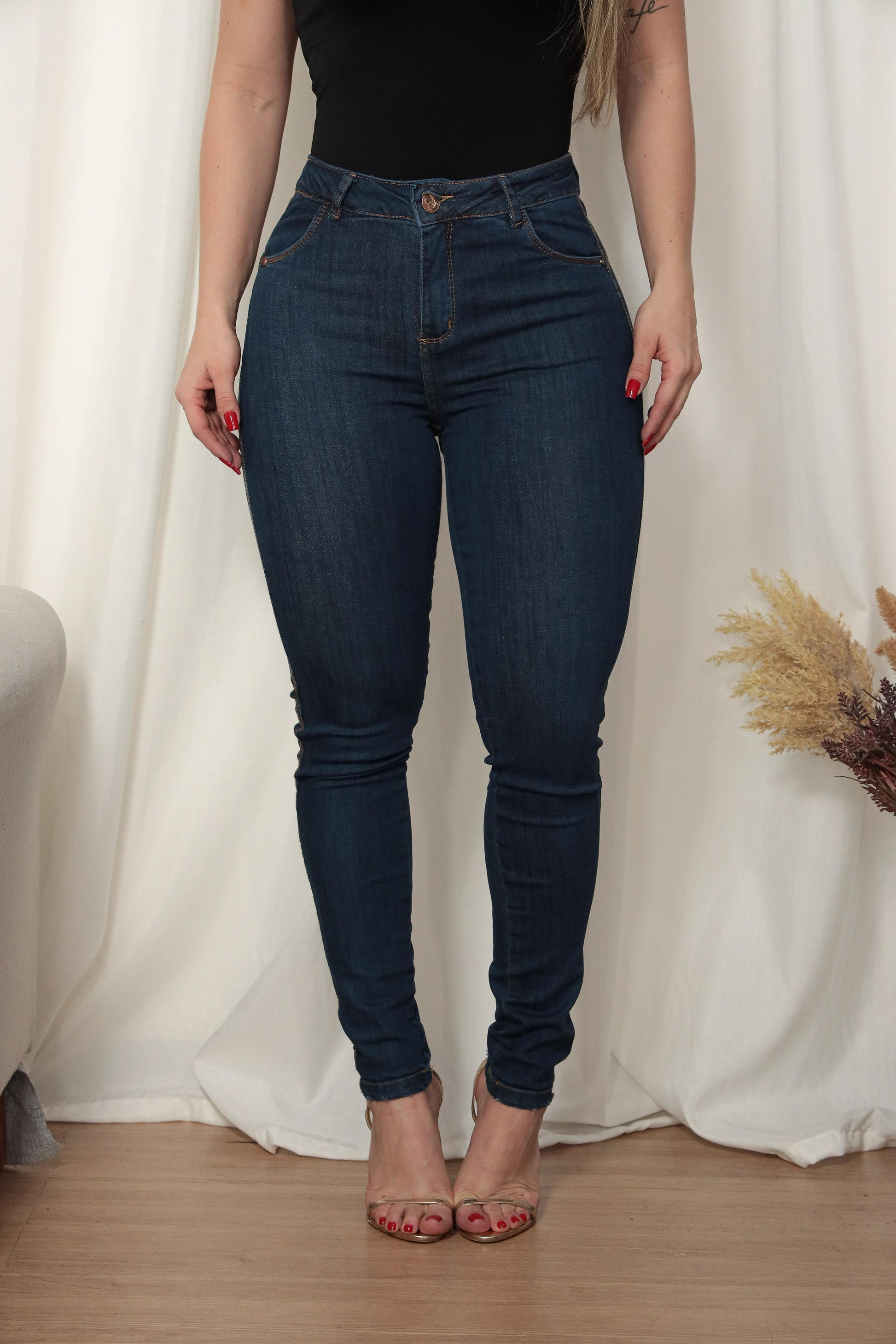 • Modelagem: Skinny — ajustada do quadril à barra