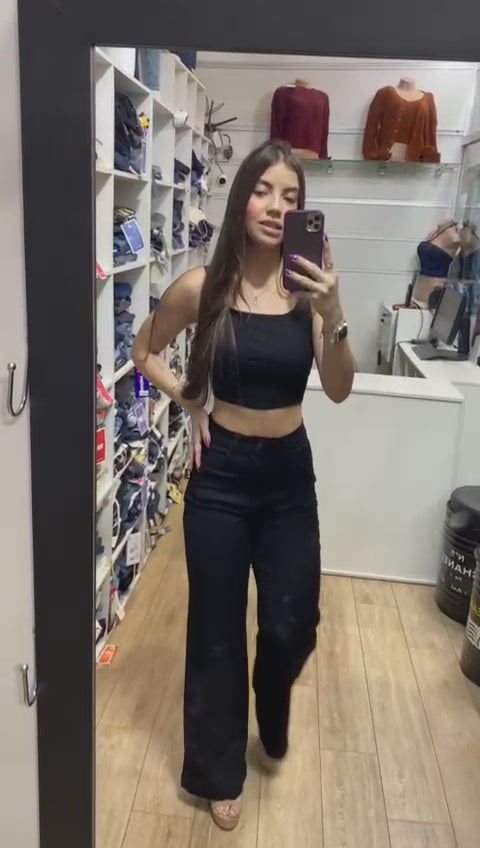 Com cor preta intensa e modelagem wide leg, essa calça transita facilmente entre looks casuais, urbanos e produções mais alinhadas.